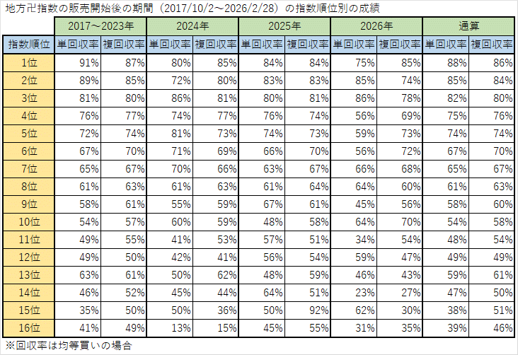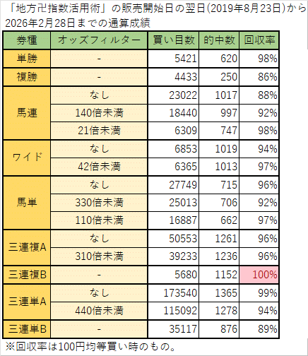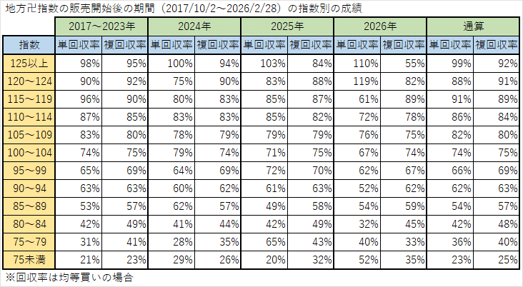 毎月、配信開始からの指数順位別、指数別の単勝回収率・複勝回収率の通算成績の最新版を公開!(※3/3更新)