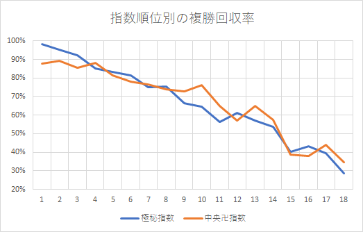 下のグラフは、極秘指数の完成後の期間(2016年12月~2019年8月11日)における極秘指数と中央卍指数の指数順位別の複勝回収率(均等買い時)です。