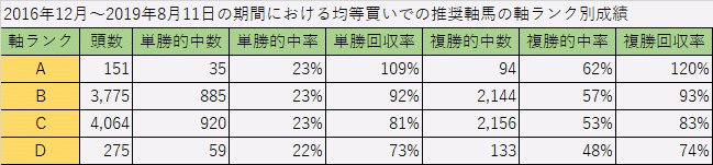 下の表は、極秘指数の完成後の期間(2016年12月~2019年8月11日)での軸ランク別の成績(フォワードテスト結果)です。